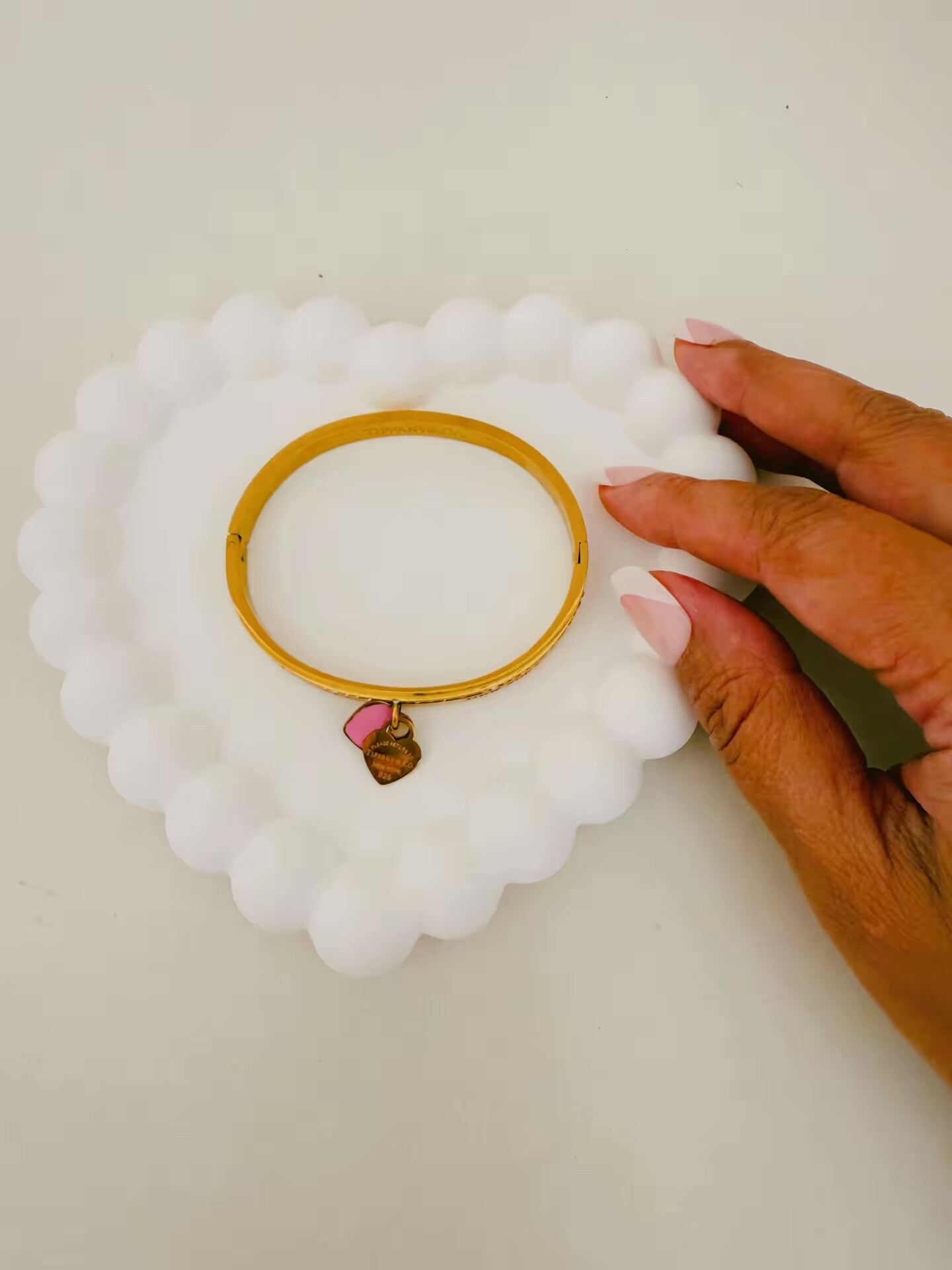 Attached to it is a small dangling charm — one side shaped like a pink enamel piece, and the other resembling a tiny gold heart charm, adding a cute and feminine touch.