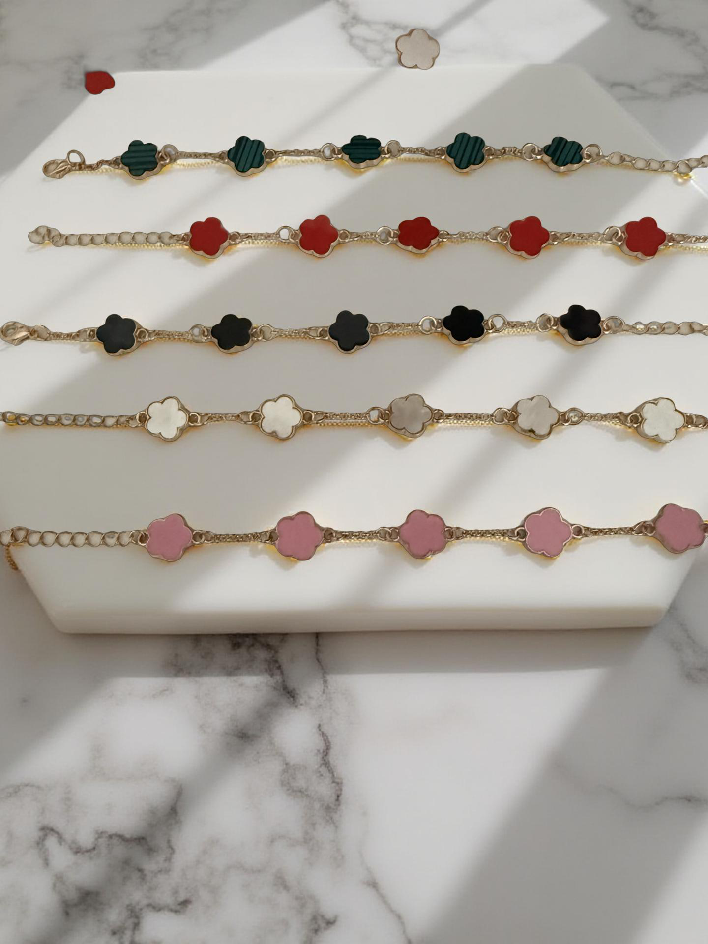 This five leaf clover necklace set comes with 1x pair of earrings, 1x braclet, 1x necklace, 1x ring and 1x bangle